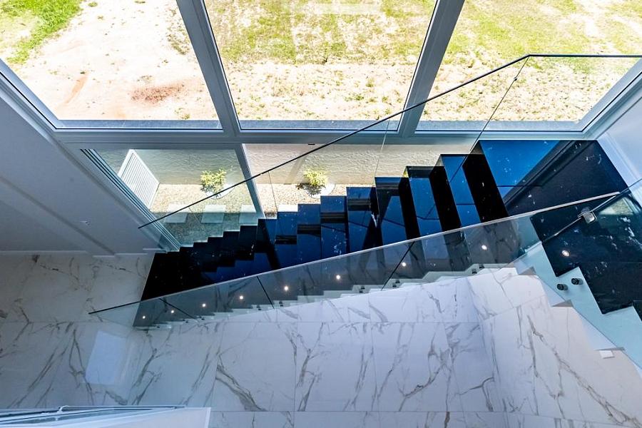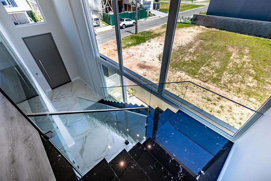• Escada revestida em granito preto via lacta com iluminação